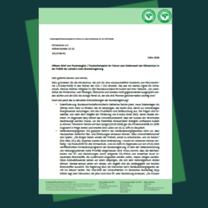 CDU/CSU versprechen viel Klimaschutz – halten aber zu wenig. Das neue Klimaschutzprogramm der Bundesregierung zeigt dies deutlich. Psychologists4Future fordern in einem offenen Brief die KlimaUnion auf, ihre Position zu „1,5-Grad aus der Mitte der Union<"/i> zu klären: Ist sie Treiber oder Feigenblatt?