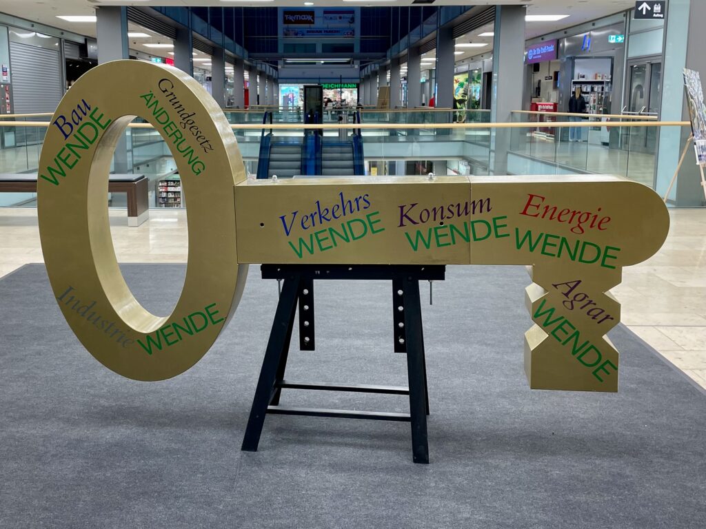 … den Schlüssel zur Zukunft? Der golden glänzende Hingucker aus Sperrholz ist mit wichtigen Transformationsbereichen beschriftet, die wir in den nächsten Jahren bewältigen müssen, wie zum Beispiel Industriewende, Agrarwende und Grundgesetzänderung. Er macht Passant*innen neugierig, bietet einen idealen Gesprächseinstieg für persönliche Kontakte, erleichtert Aufmerksamkeit für Presseerklärungen und zieht nicht nur Kinder magisch an. Als parteipolitisch neutrales Symbol ermöglicht der Schlüssel einen Zugang ohne Vorbehalte – ein Schlüssel als Türöffner, um Menschen nicht nur rein kognitiv anzusprechen. War die erste Version 2021 vor dem Bundestag noch 5 m lang und aus Pappe, so wurde 2022 eine transportable, regenfeste Version aus Sperrholz geschaffen. Sie kommt gerne auf Rad-Demos zum Einsatz oder steht bei Info-Ständen auf Marktplätzen. In Märchen und Geschichten steht das Auftauchen eines kleinen goldenen Schlüssels dafür, dass es garantiert spannend weitergeht: Diese Fortsetzung wünschen wir auch dem großen Exemplar!